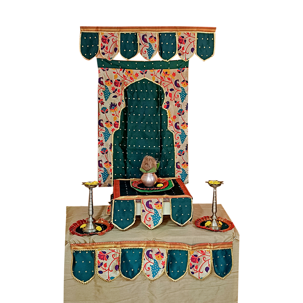Each component contributes to creating a rich festive atmosphere. The motifs add cultural depth, the colours brighten the environment, and the coordinated theme ties everything together. Therefore, this combo set becomes ideal for Ganesh Chaturthi celebrations, Diwali décor, housewarming events, and any religious ritual that calls for a vibrant setup.