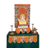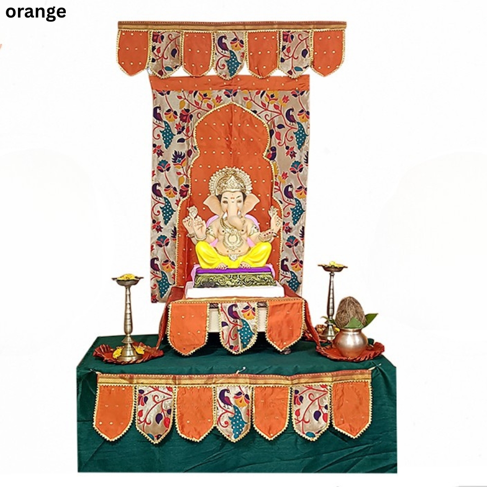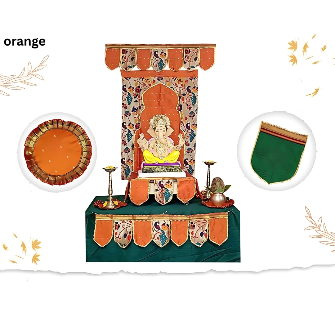 The Paithani Ganpati decoration combo set orange brings a bright and coordinated festive look to your Ganesh Chaturthi celebration. This set includes seven decorative elements along with a free samai asan, giving you a complete and visually balanced setup. The orange theme creates a warm, joyful, and vibrant atmosphere that suits the spirit of the festival.