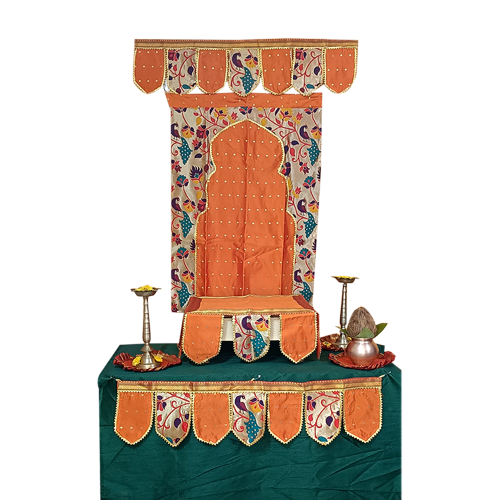 Each piece in this combo features Paithani-inspired patterns. The motifs reflect traditional Maharashtrian artistry and add cultural richness to your décor. The orange tones blend beautifully with the designs, making the entire arrangement feel lively and harmonious. Because the colours are bold and festive, they enhance any pooja or mandap setting instantly.