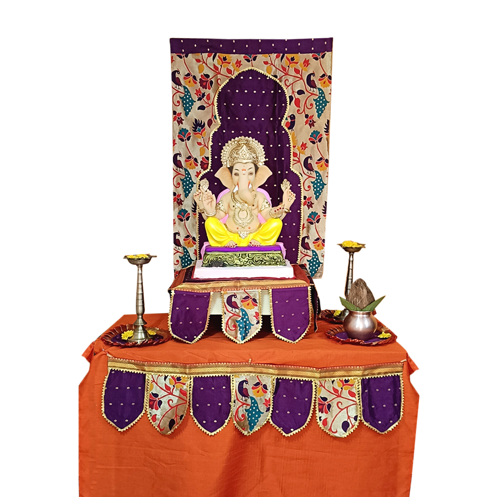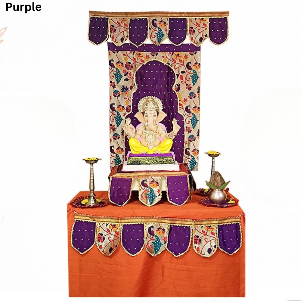 The Paithani Ganpati decoration combo set purple theme brings elegance, colour, and cultural richness to your Ganesh Chaturthi celebrations. This seven-piece combo helps you create a beautifully coordinated festive setup that enhances your mandap or pooja corner. The purple palette adds a royal and vibrant touch, making the entire arrangement visually stunning.