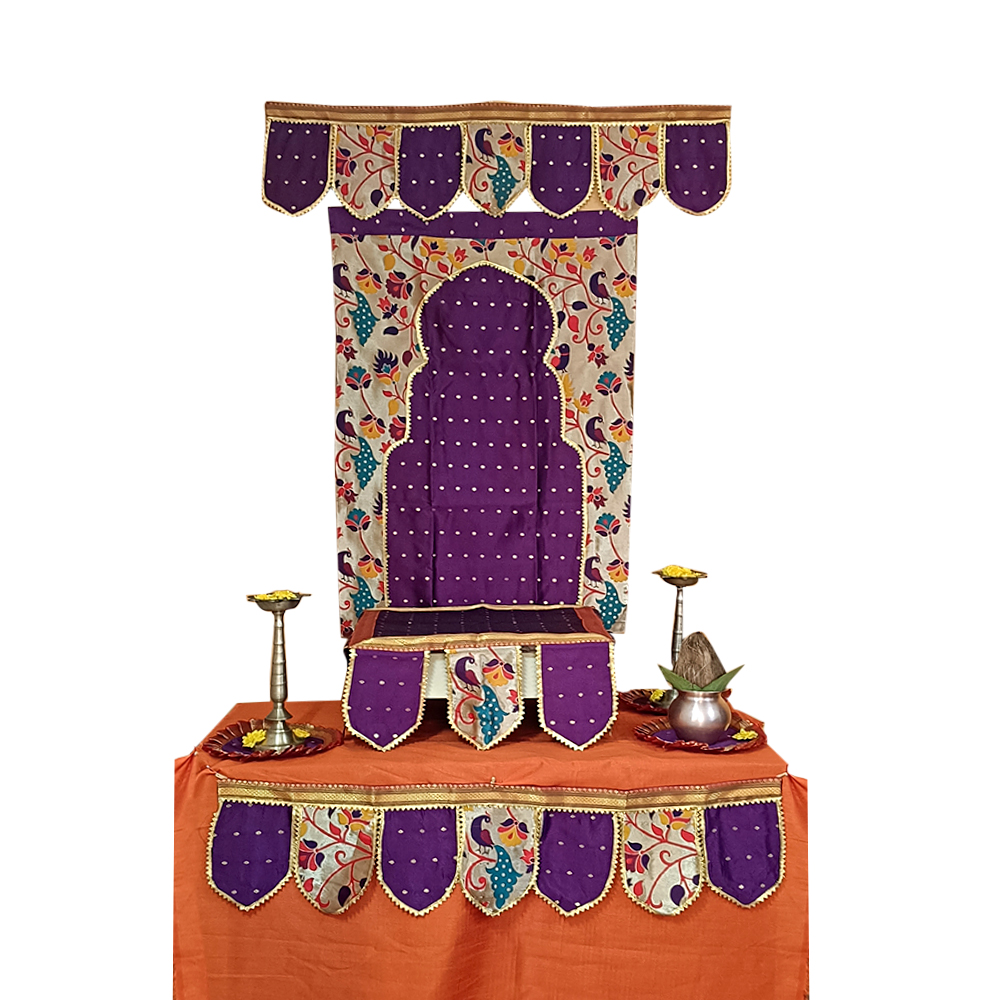 Each element supports the festive mood by adding colour, tradition, and detail. The purple tones bring richness, the Paithani motifs add heritage, and the coordinated arrangement creates harmony. Therefore, this combo set becomes a wonderful choice for Ganesh Chaturthi, Diwali, housewarming ceremonies, and other cultural events.