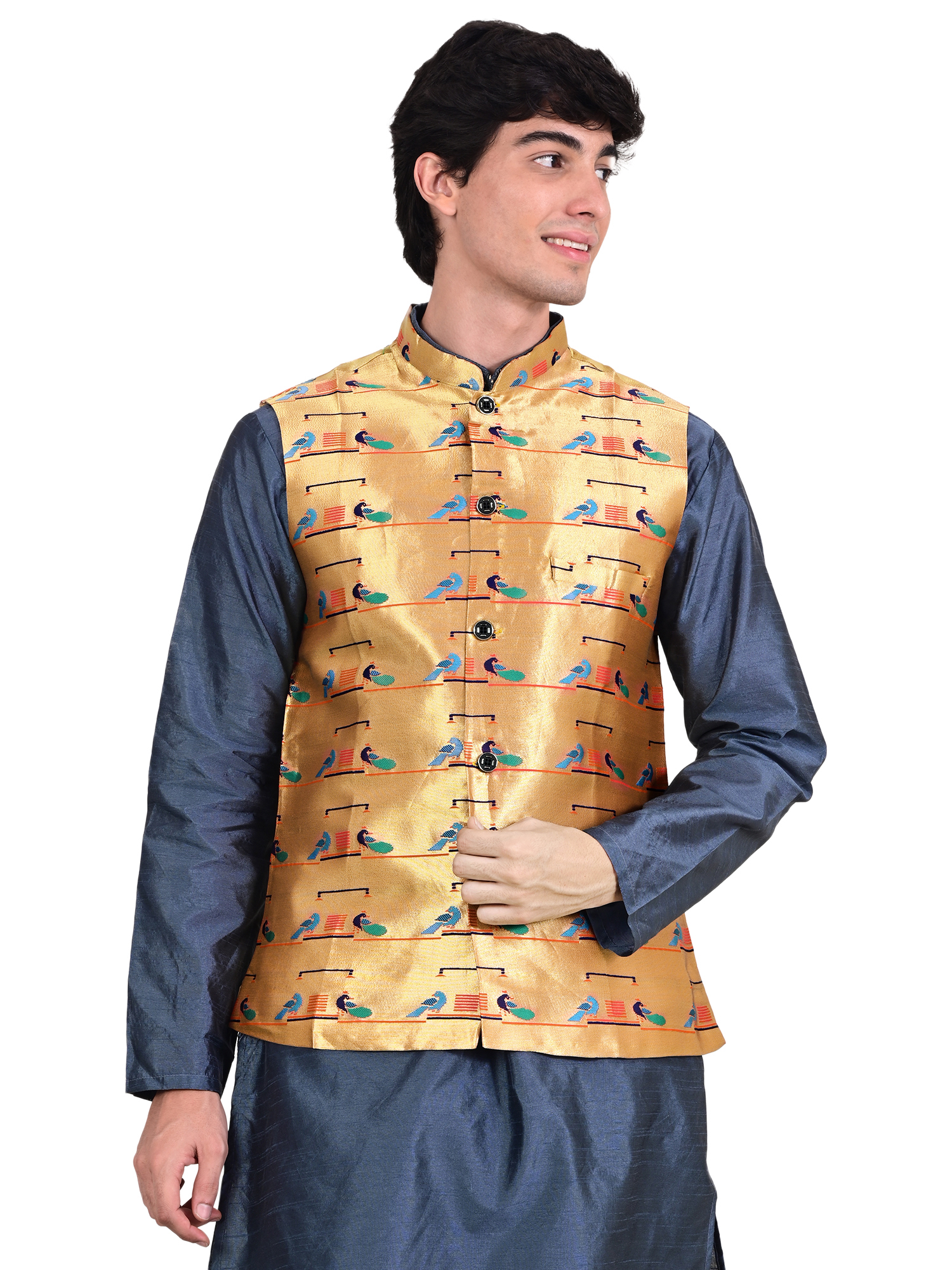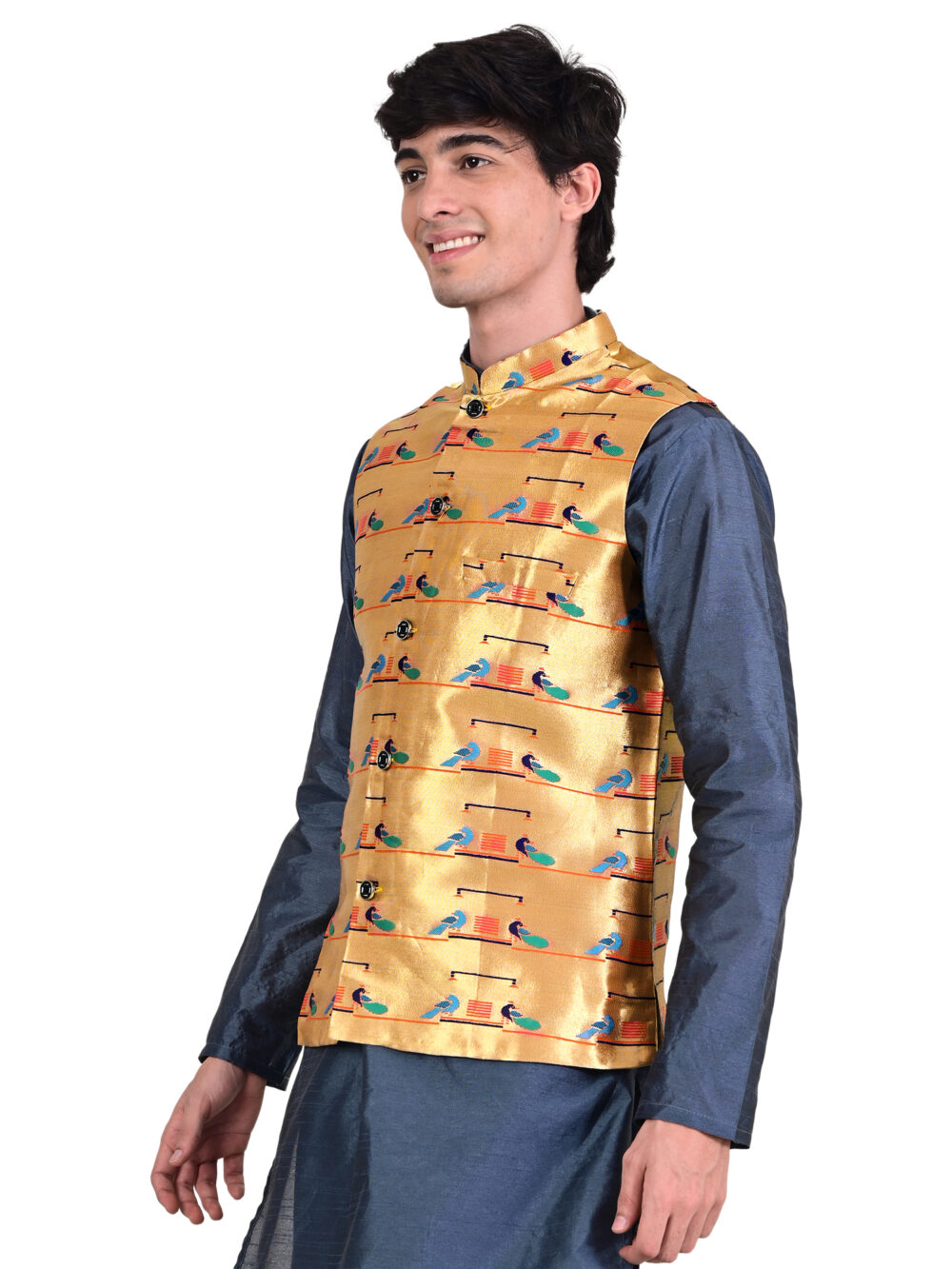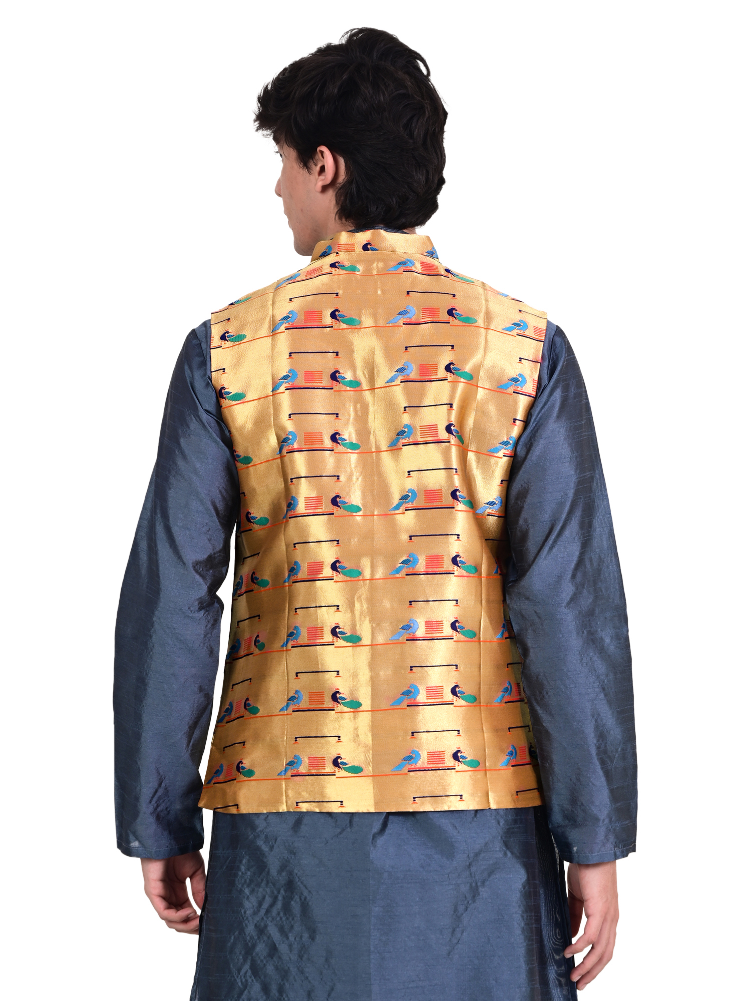 The Paithani jacket for men double peacock design brings elegance, cultural richness, and festive energy to your wardrobe. This jacket showcases traditional Paithani artistry through its bold double peacock motif, making it a strong statement piece for celebrations and cultural events. The colours stand out beautifully, creating a refined and eye-catching look.
