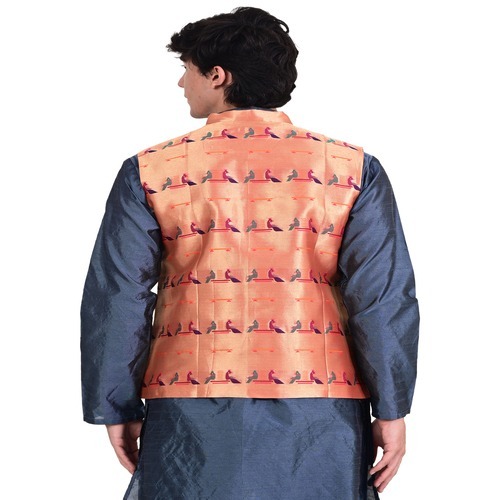 This Paithani jacket gives men a rich and traditional festive look. Its detailed motifs, vibrant tones, and comfortable structure make it a standout wardrobe essential for every cultural celebration.