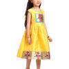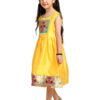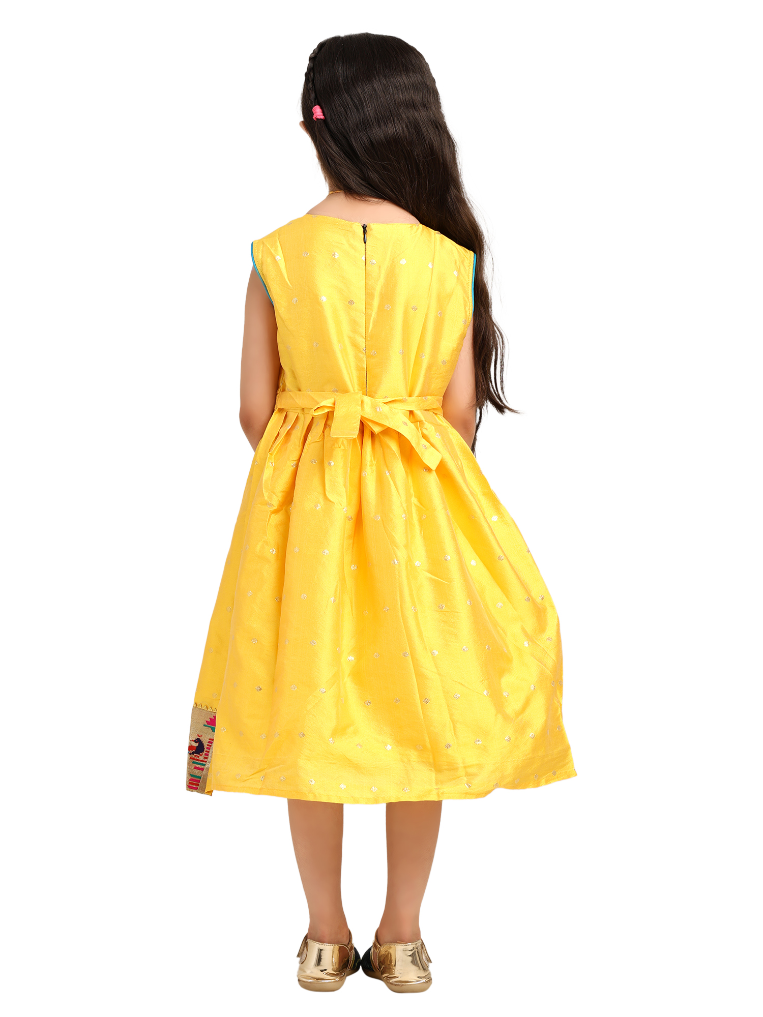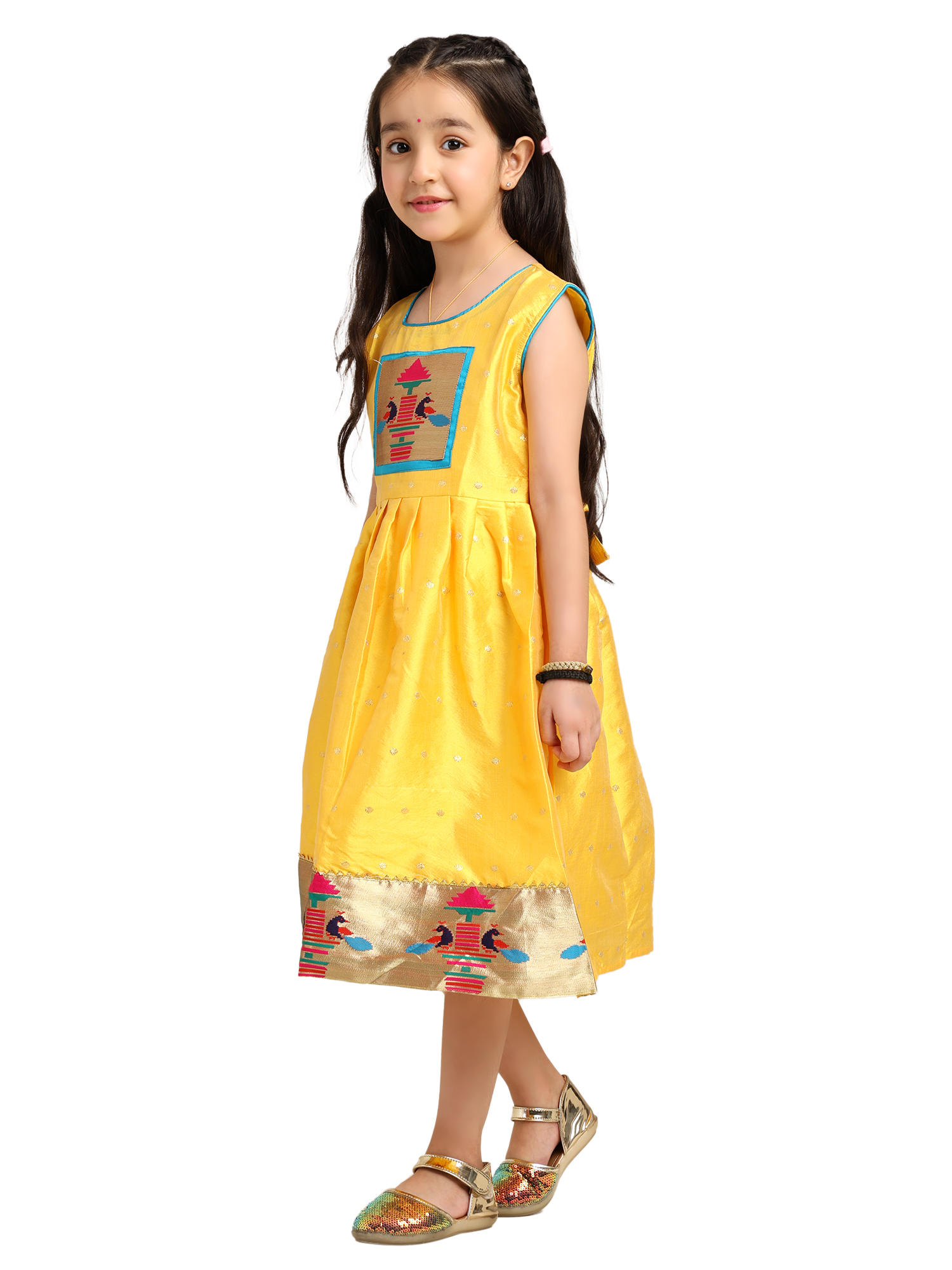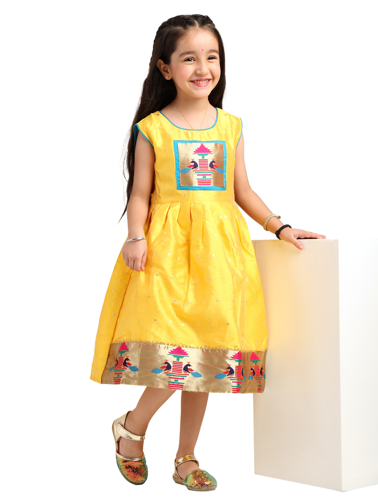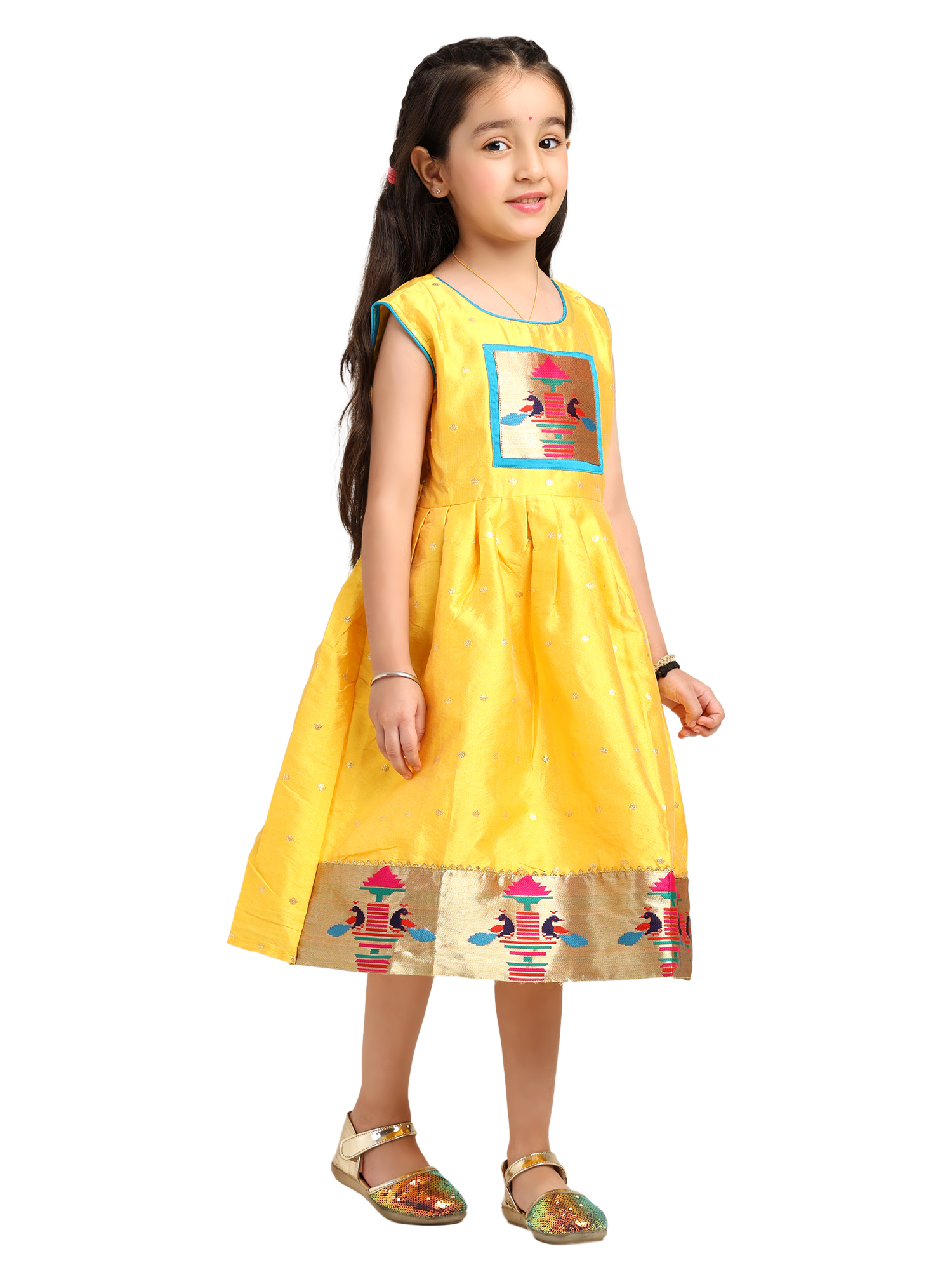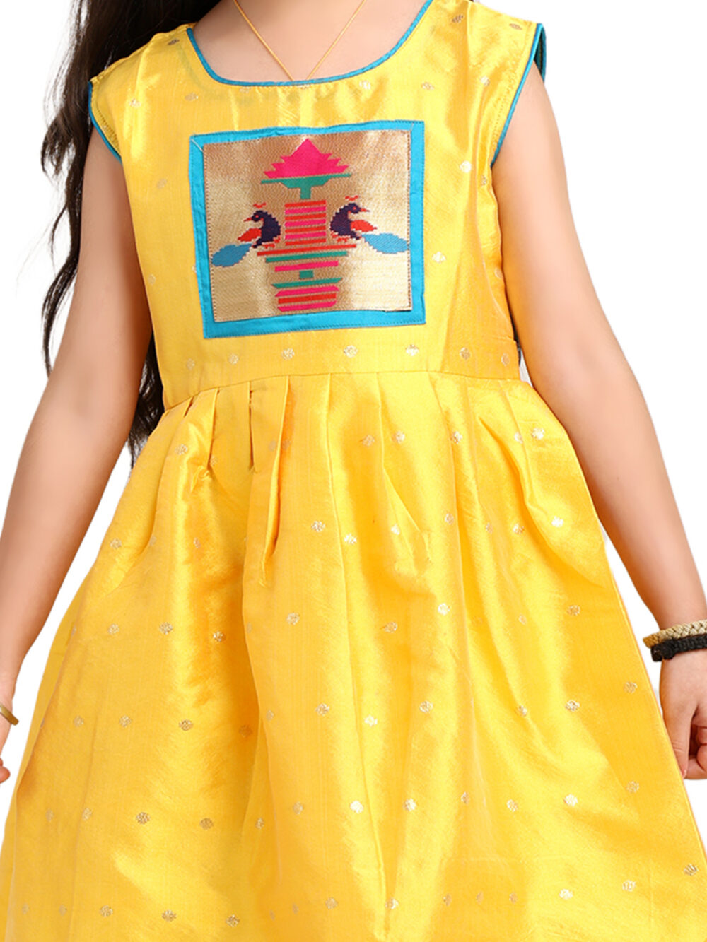 The Paithani baby girl frock yellow silk design is a beautiful blend of comfort, tradition, and festive charm. It is crafted to make your child stand out during celebrations. The bright yellow silk fabric gives the outfit a rich look, while also keeping it soft and comfortable for long hours.
