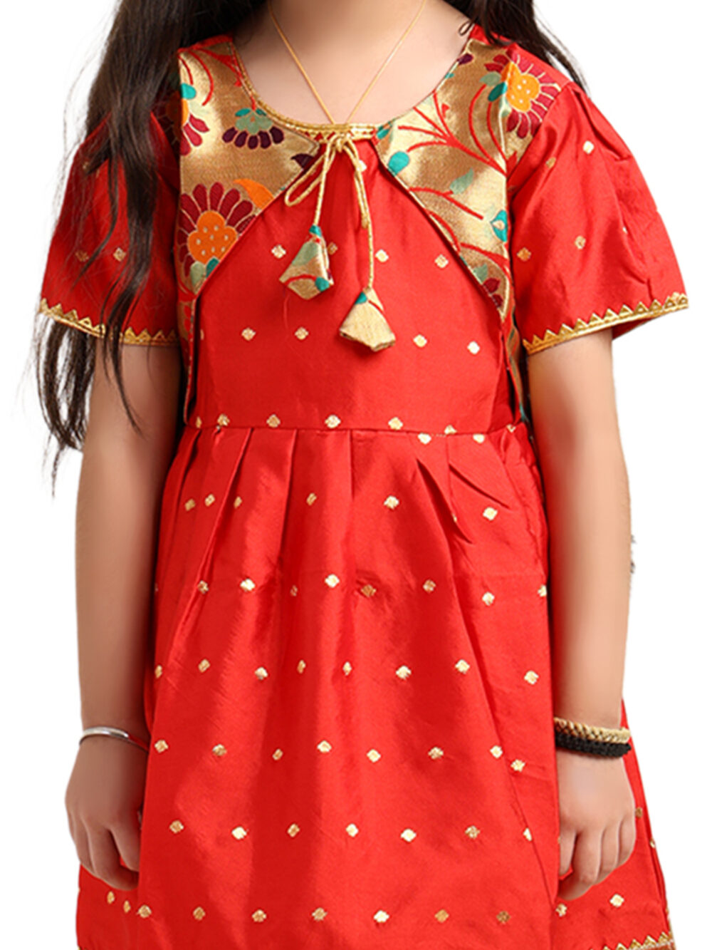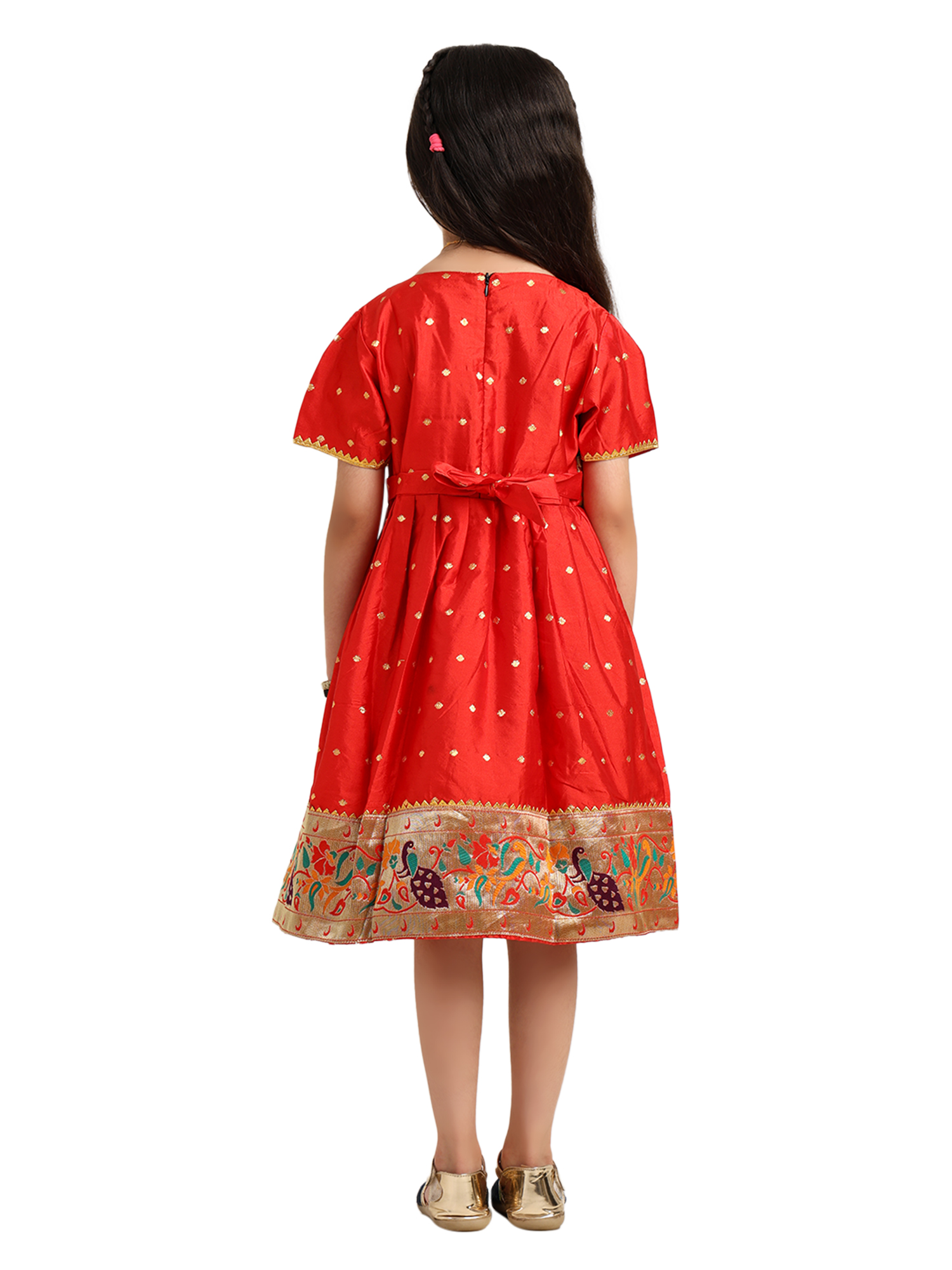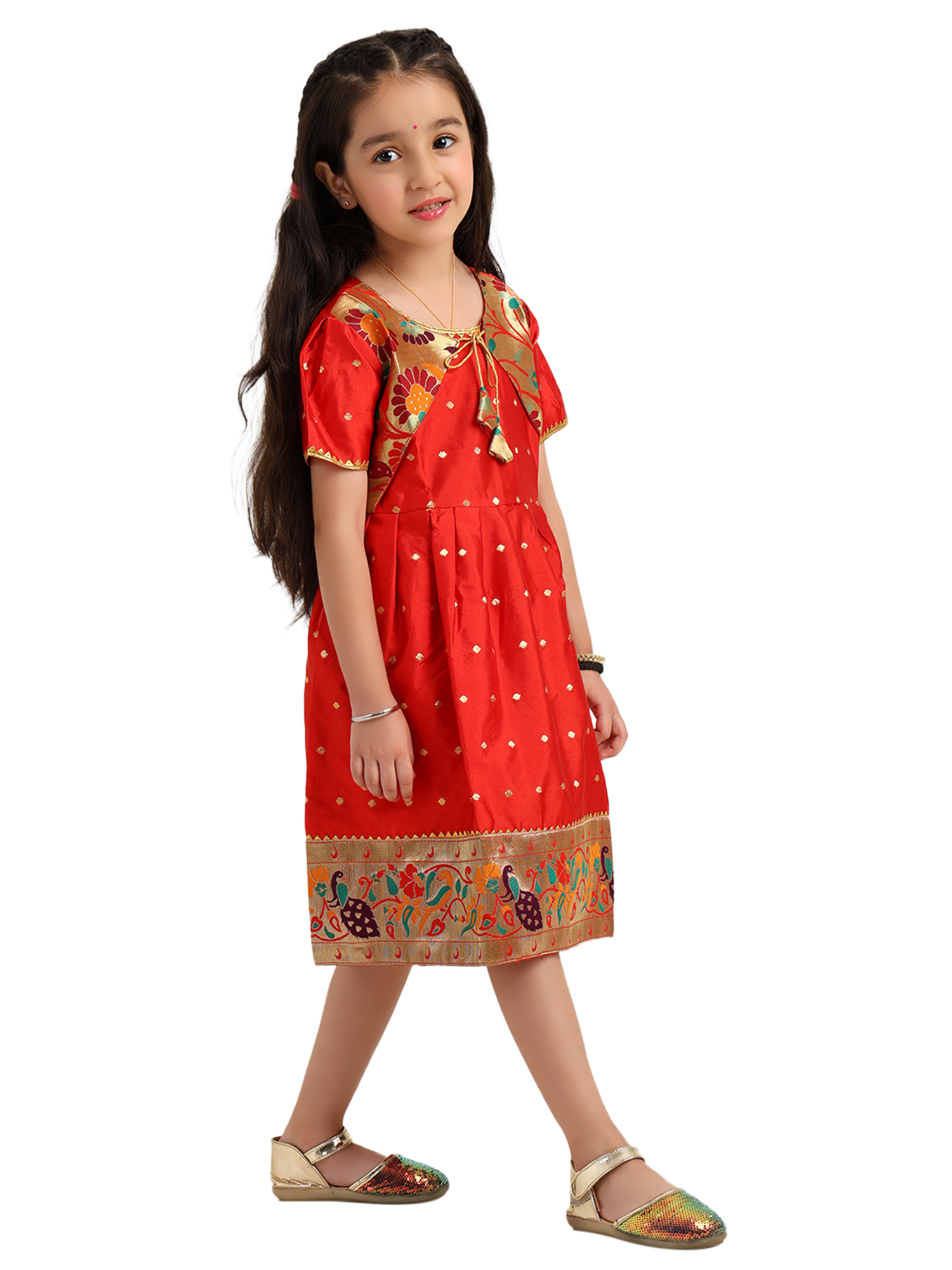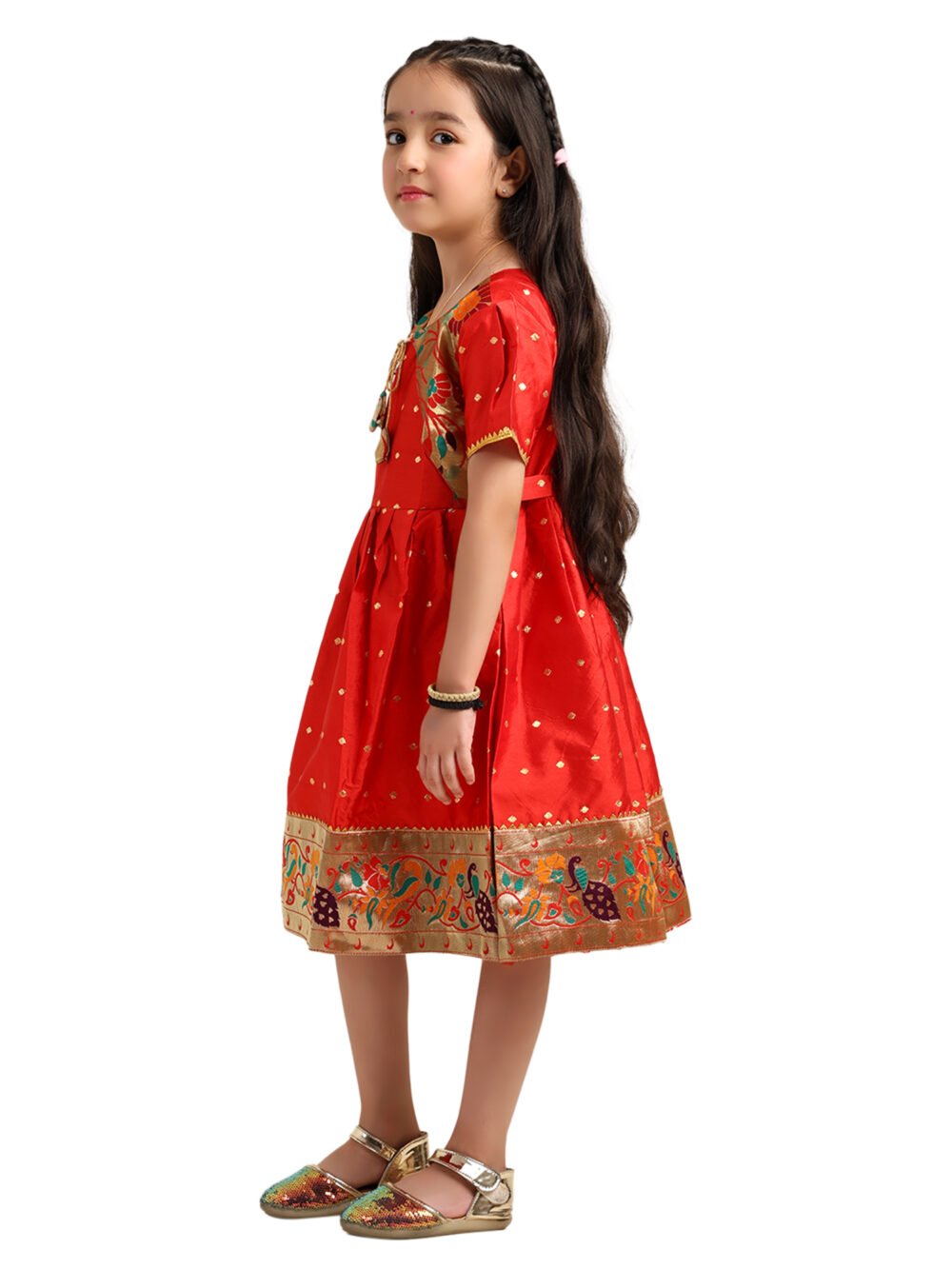• Bright red silk frock designed with premium Paithani-inspired craftsmanship