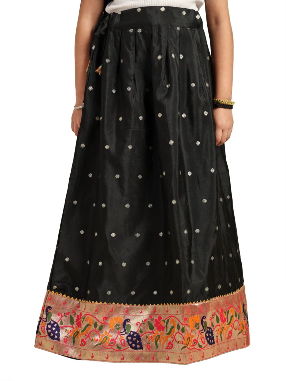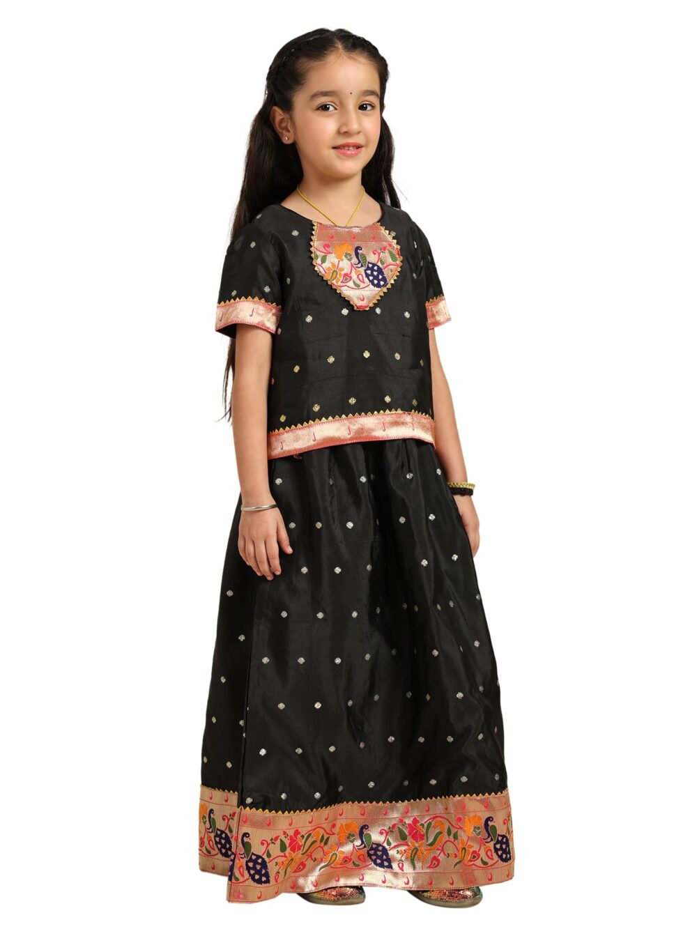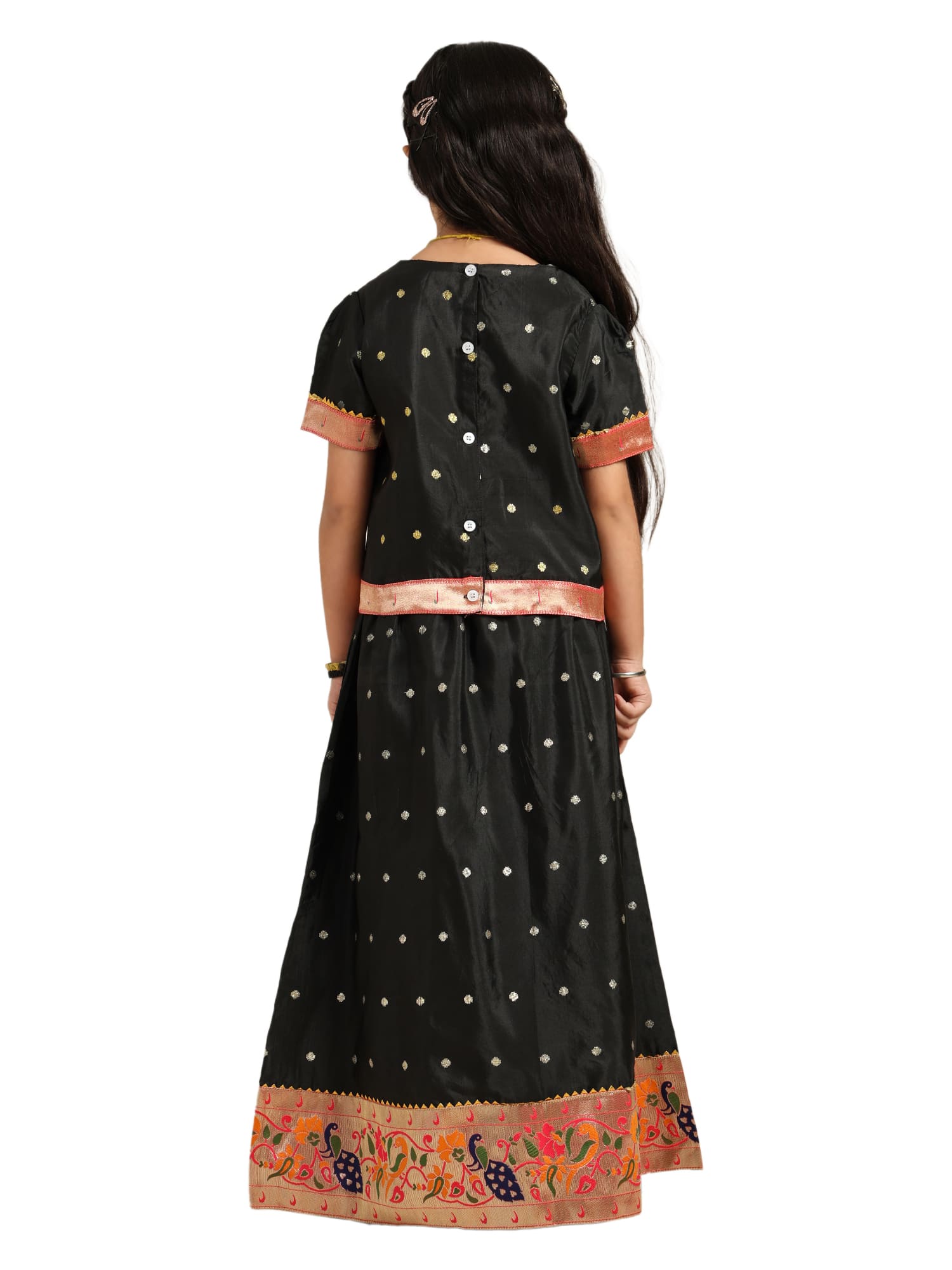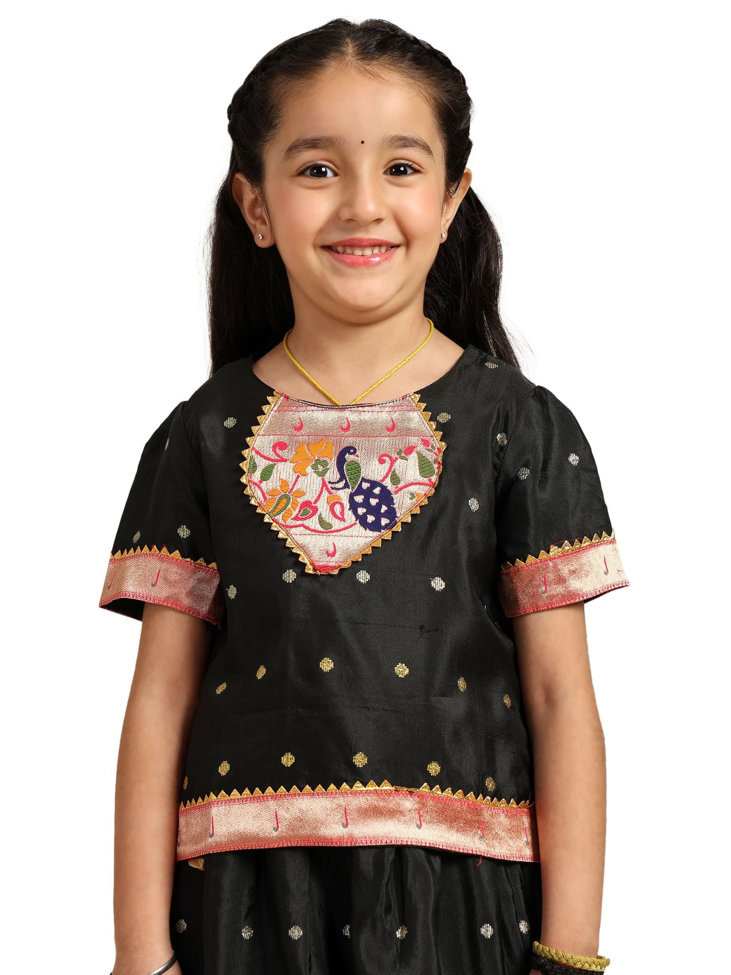 Paithani Baby Girl Lehenga Set – Black Silk with Peacock Embroidered Blouse & Zari Border Skirt – Chiu Pattern