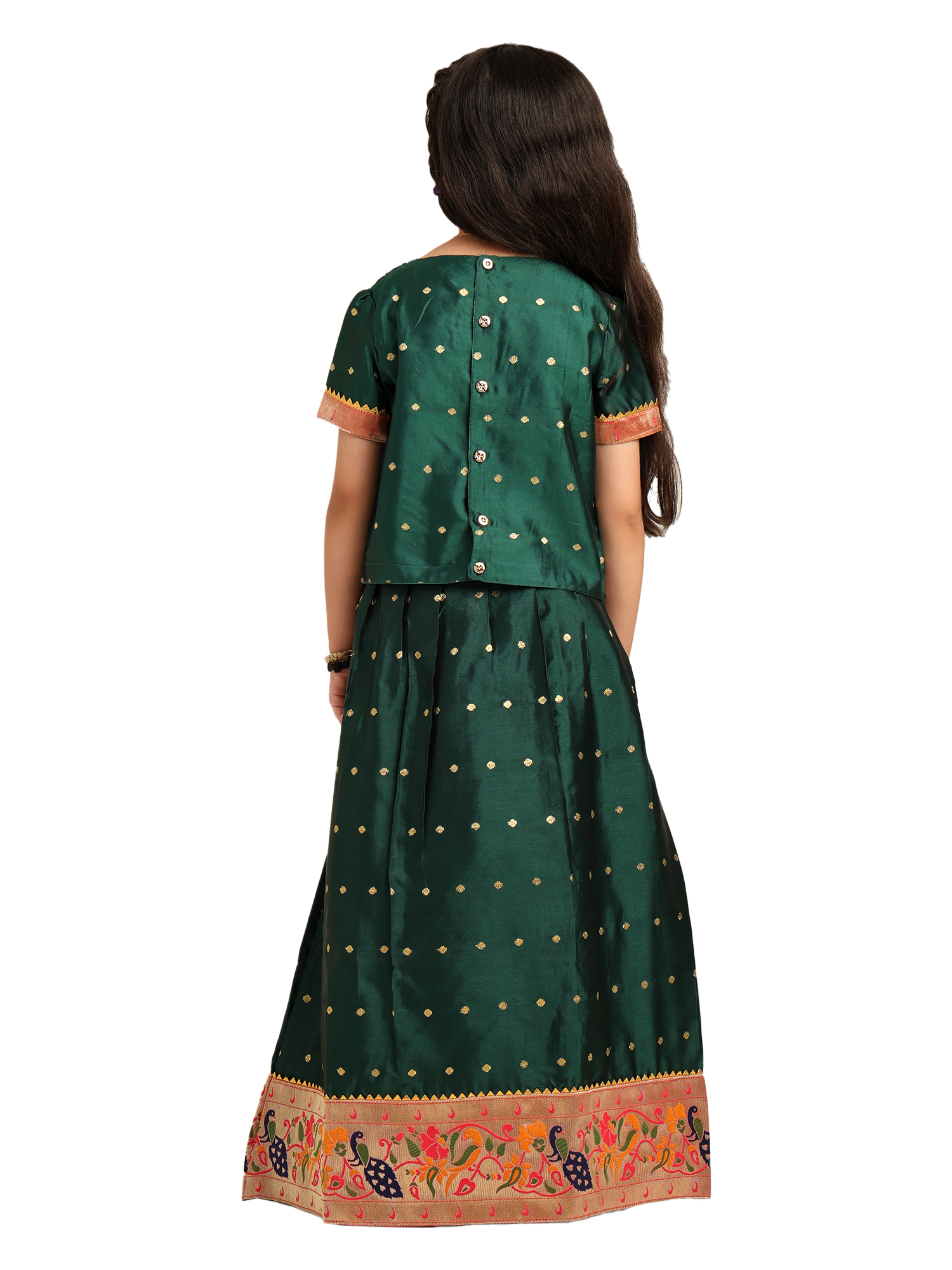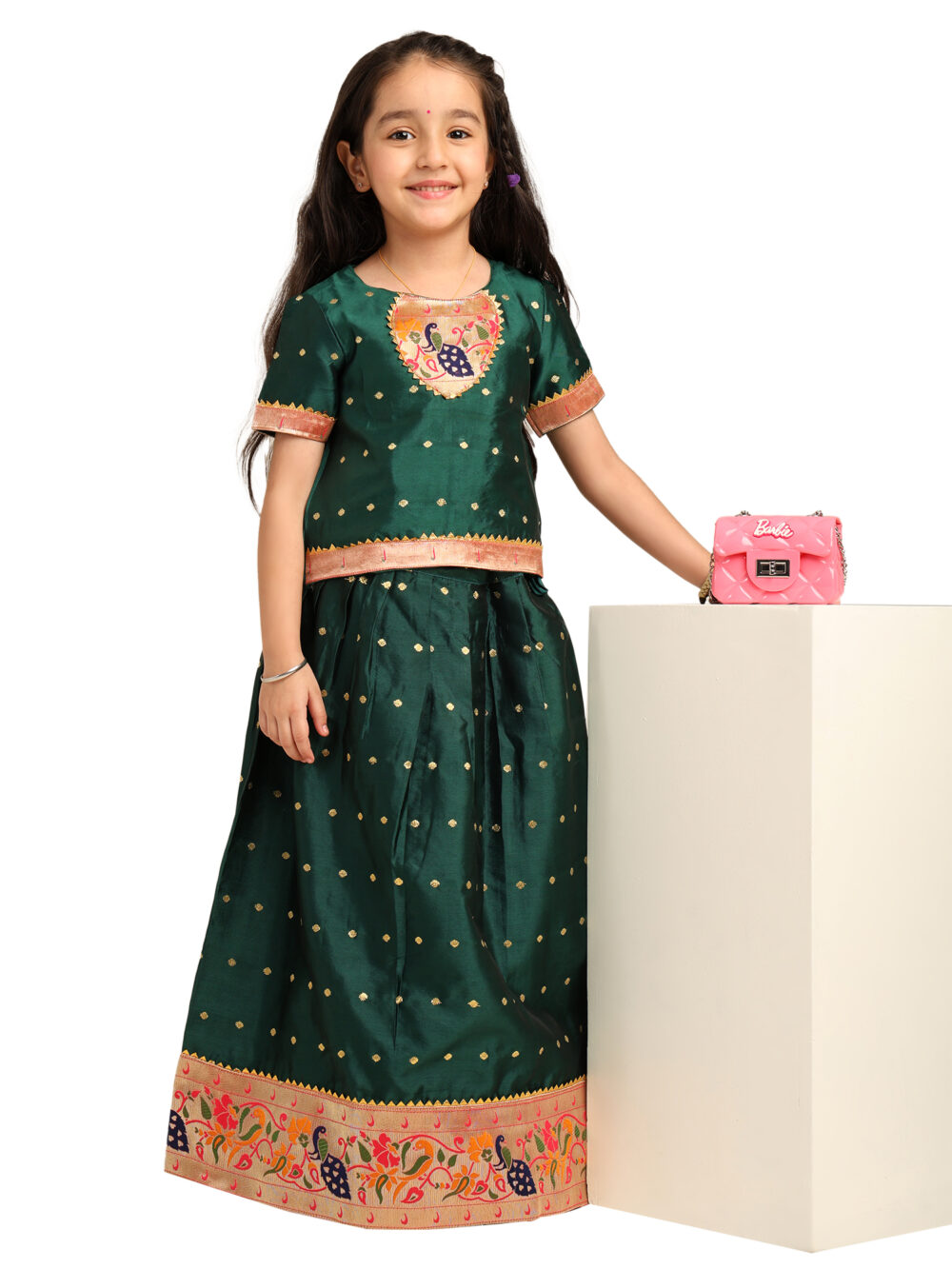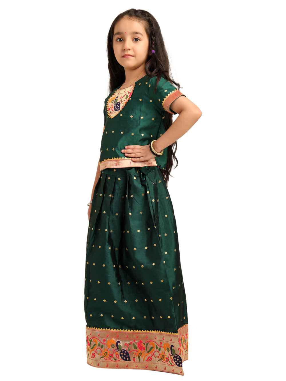 Paithani Baby Girl Lehenga Set – Green Silk with Peacock Embroidered Blouse & Zari Border Skirt – Chiu Pattern