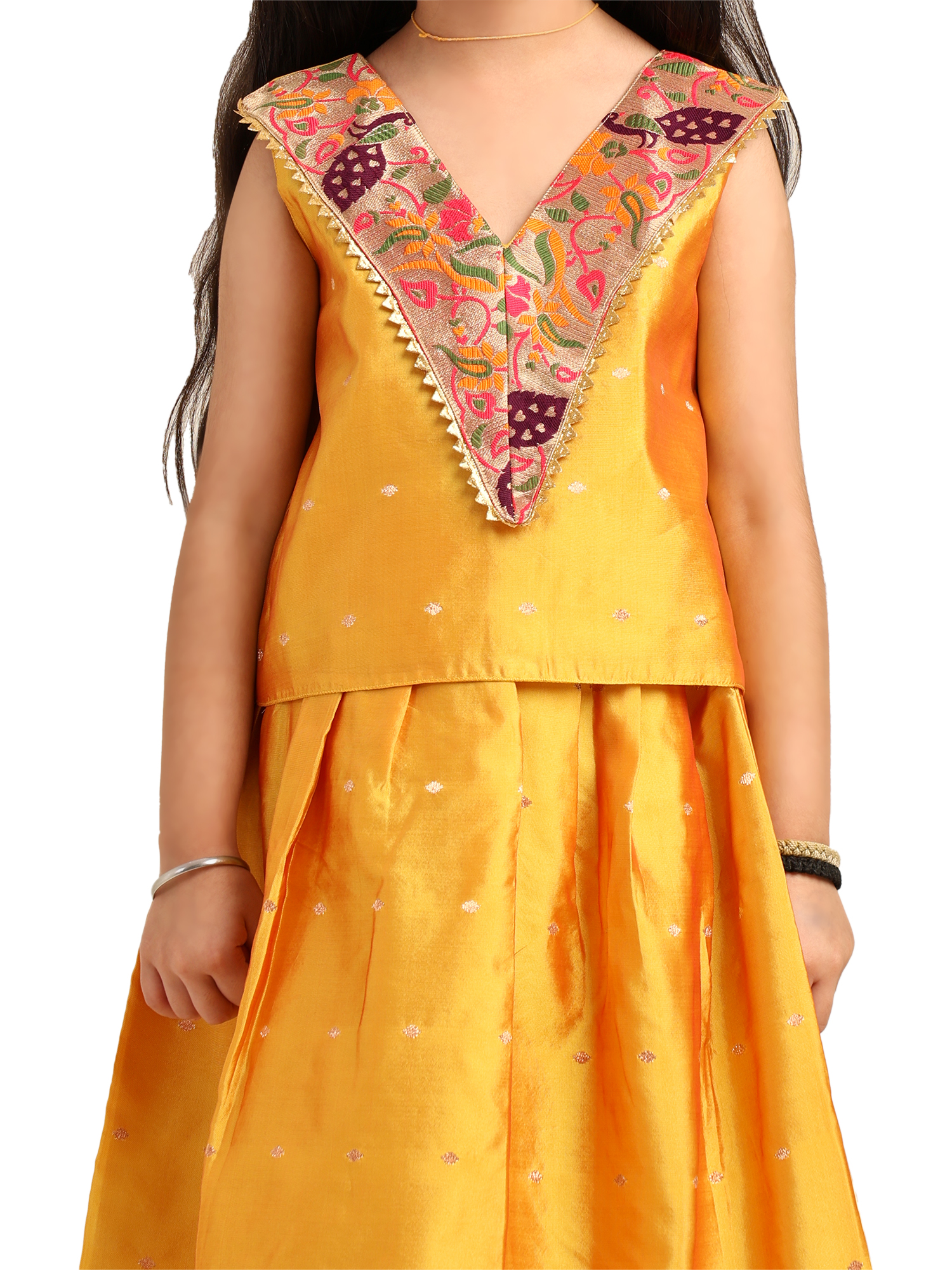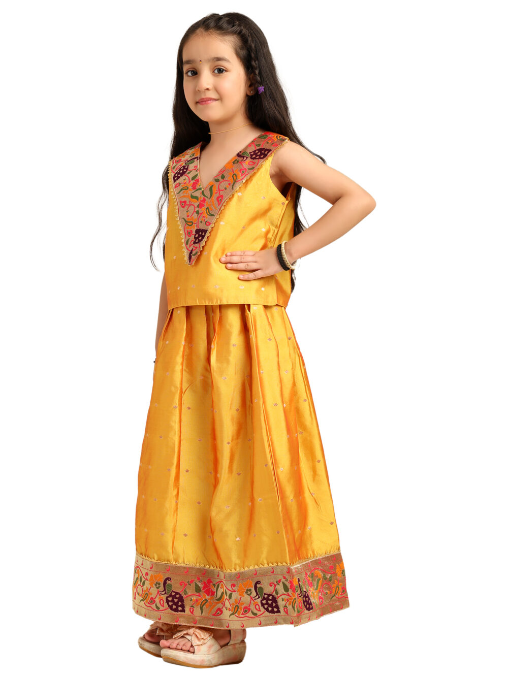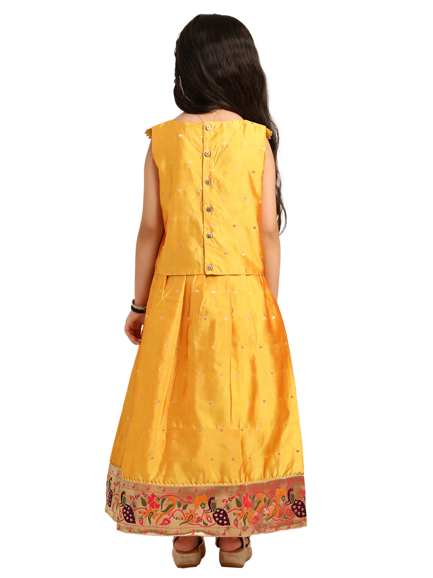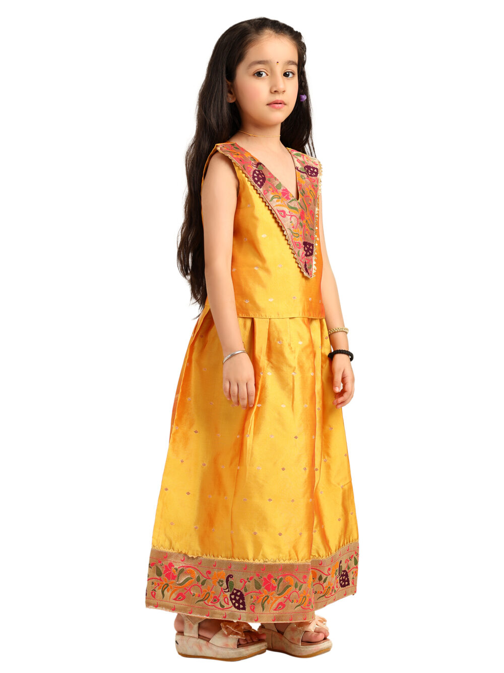 Celebrate your little girl’s special occasions with this vibrant Paithani Baby Girl Lehenga Set in rich mustard yellow silk. The warm shade instantly brightens festive celebrations and photographs beautifully in both indoor and outdoor lighting. It creates a joyful look that suits weddings, festivals and family events.