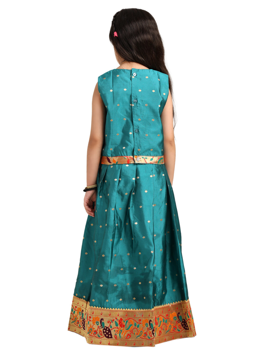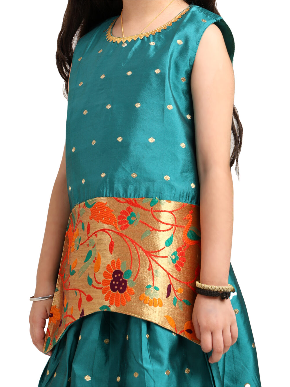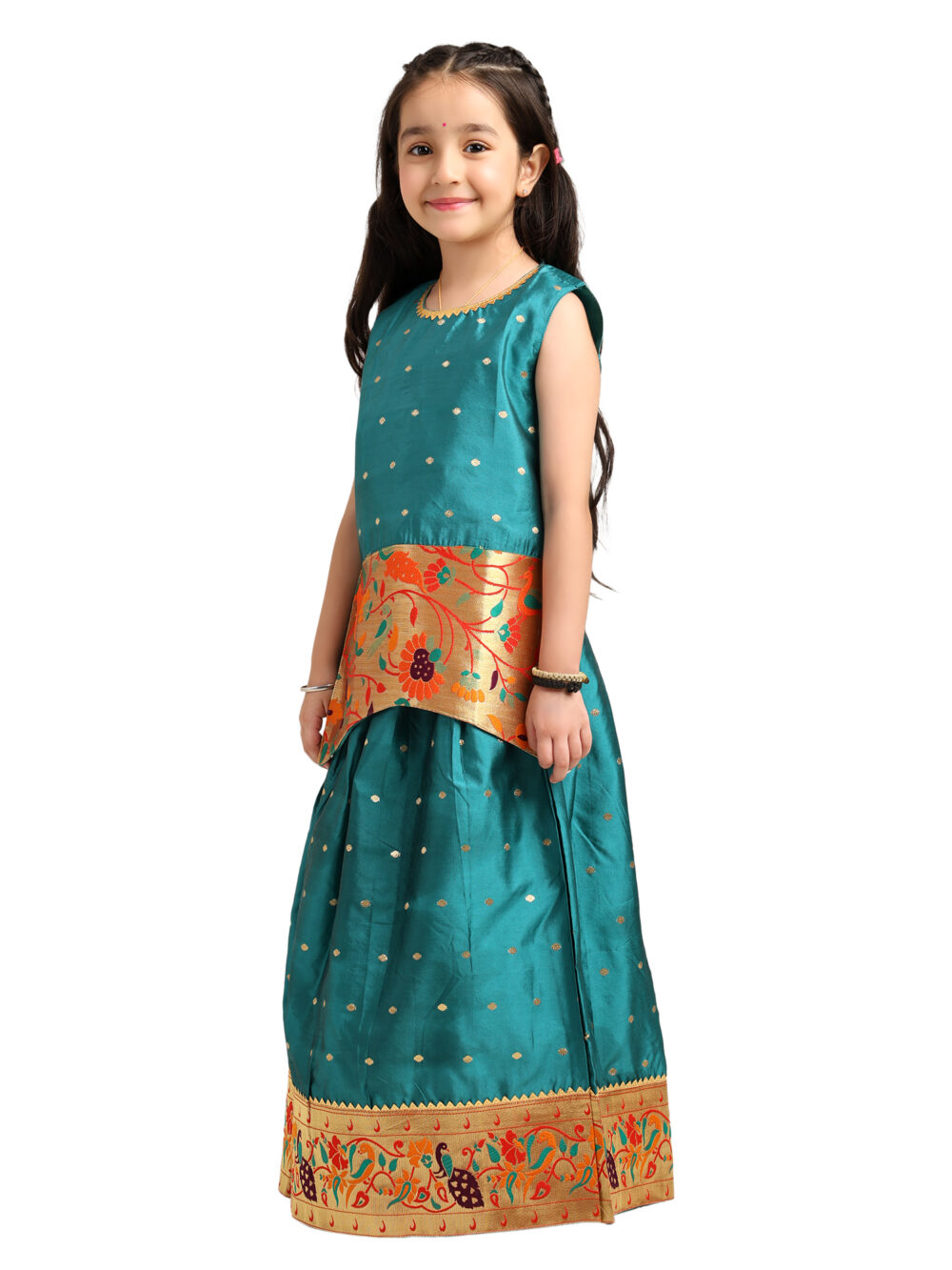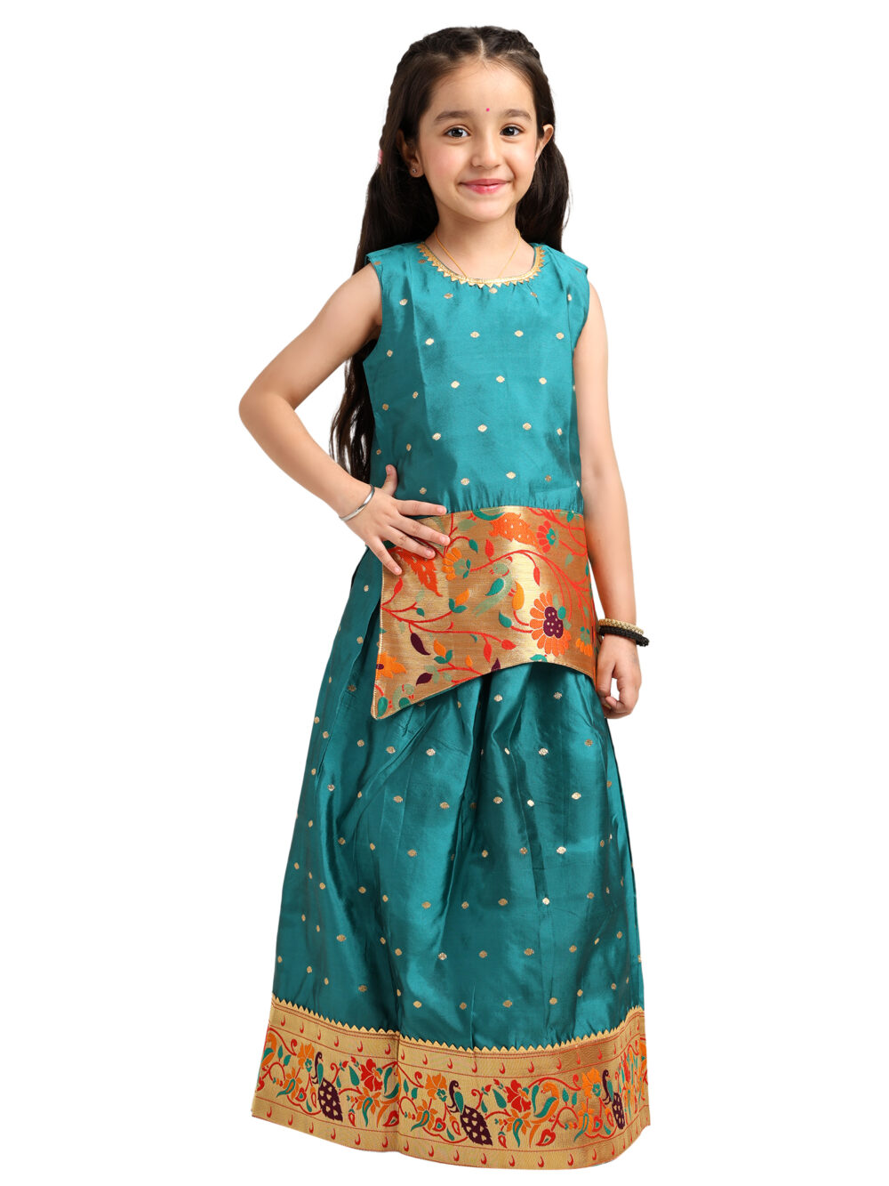 The lehenga features a peacock zari border, which enhances the traditional Paithani feel. The colours in the border stand out nicely against the teal base. Moreover, the zari gives the outfit a festive sparkle without making it heavy. As a result, your child can move comfortably during long events.