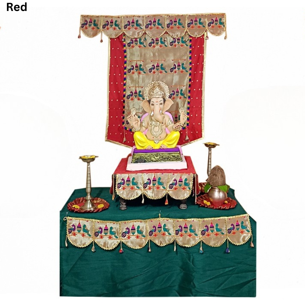 The Paithani parrot peacock Ganpati decoration red theme adds colour, vibrance, and cultural significance to your Ganesh Chaturthi décor. This seven-piece combo set helps you create a beautifully coordinated and festive mandap. The deep red palette brings energy and warmth, making your celebration space look traditional and inviting.
