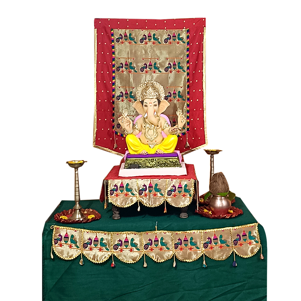 This Paithani parrot peacock Ganpati decoration combo set transforms your pooja space into a vibrant, culturally rich, and beautifully arranged festive corner. It brings tradition, colour, and harmony to every Ganesh Chaturthi celebration.