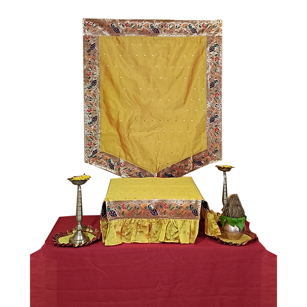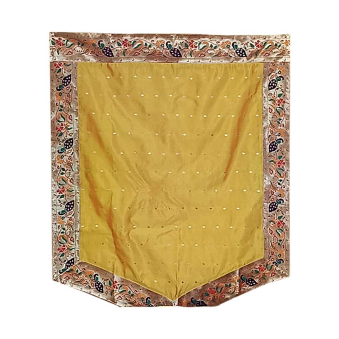 Featuring premium silk fabric, the backdrop showcases a warm mango-yellow tone that radiates happiness and festivity. It is framed by shimmering gold-zari borders and adorned with intricate side-pattern motifs inspired by traditional Paithani floral and vine weaving. When placed behind your Ganesha idol or at your pooja setup, it instantly elevates the space with cultural depth and colour.