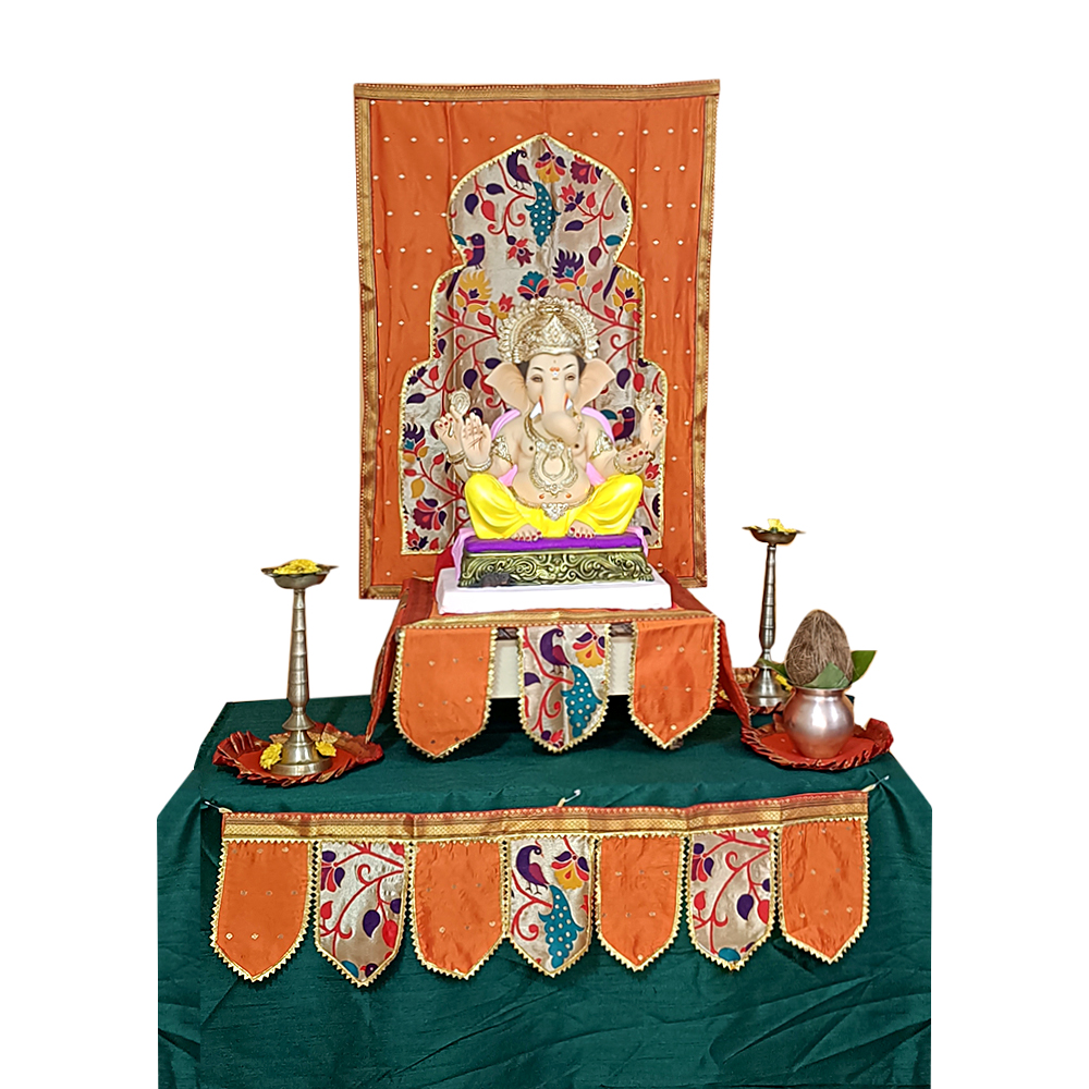 The Paithani temple decoration combo set orange theme gives your Ganesh Chaturthi décor a warm, vibrant, and culturally rich look. This seven-piece combo offers a complete decorative solution for your mandap or pooja room. The bright orange palette adds energy and festive charm to your celebration space, making it look inviting and joyful.