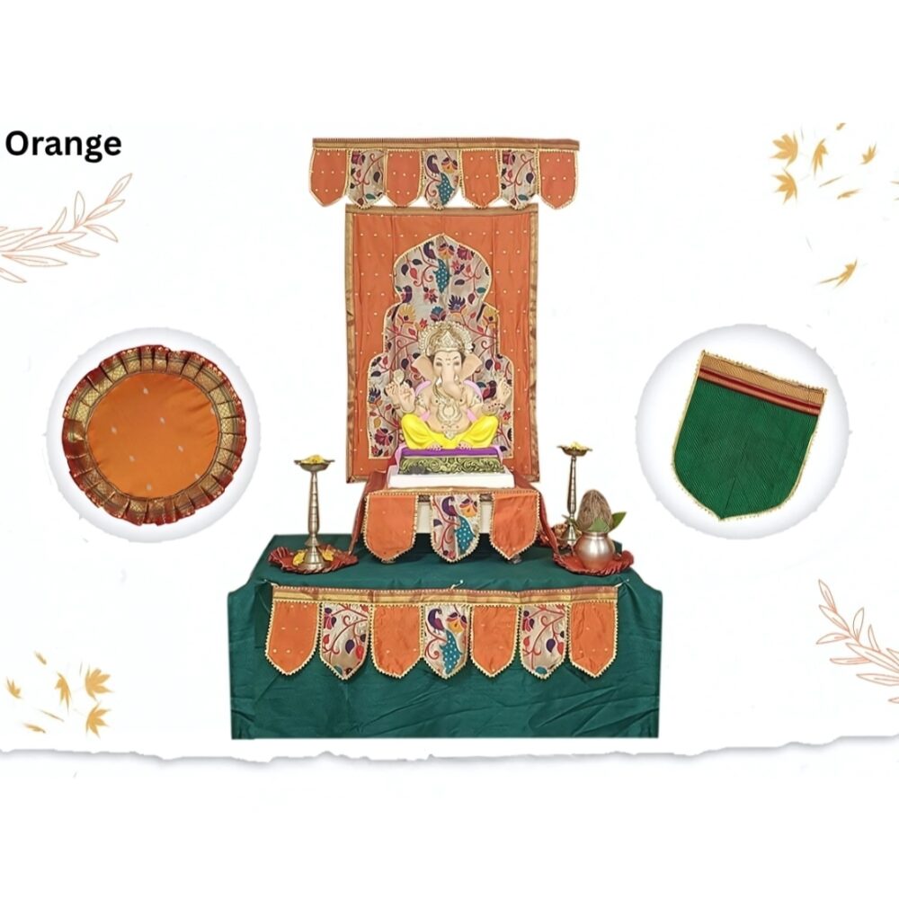 Every component of this combo supports the overall festive mood. The orange palette brings brightness, the Paithani patterns add cultural richness, and the coordinated layout offers visual harmony. Therefore, this combo becomes ideal for Ganesh Chaturthi, Diwali, housewarming ceremonies, and other traditional celebrations.