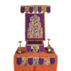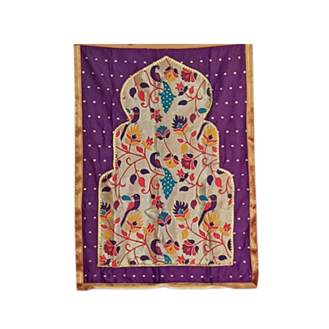 Crafted from premium silk fabric, the backdrop features a deep purple base enhanced by luminous gold-zari borders and intricate Paithani-inspired motifs—such as temple-arches, peacocks and classic geometric patterns. The “temple-pattern” design evokes the splendour of a sacred doorway, instantly enriching your altar or mandap with sacred ambiance.