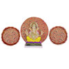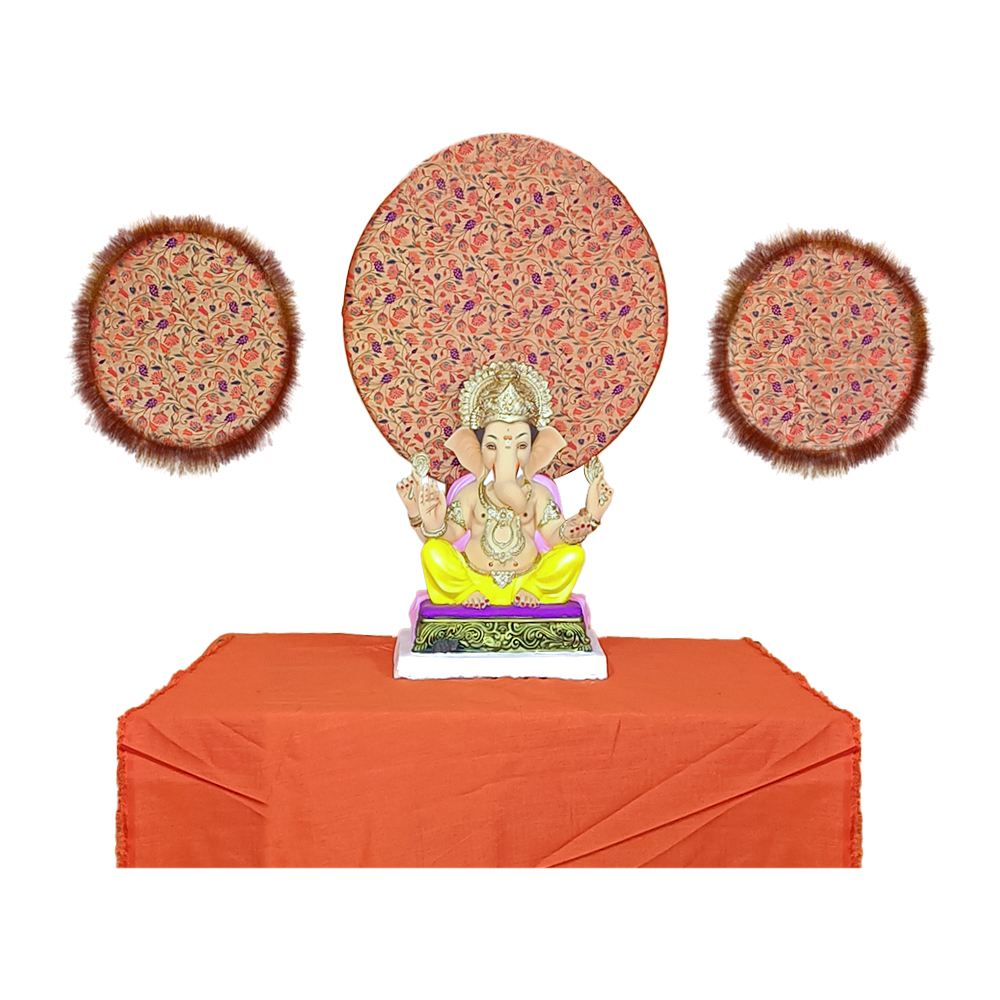 Add visual depth and divine symmetry to your Ganesh Chaturthi mandap with this Paithani Three Chakra Backdrop Set. Crafted in rich floral Paithani fabric, this 3-piece design includes one large 24-inch chakra panel placed behind the idol and two smaller 15-inch side chakras that frame the mandap beautifully.