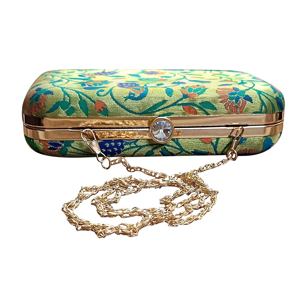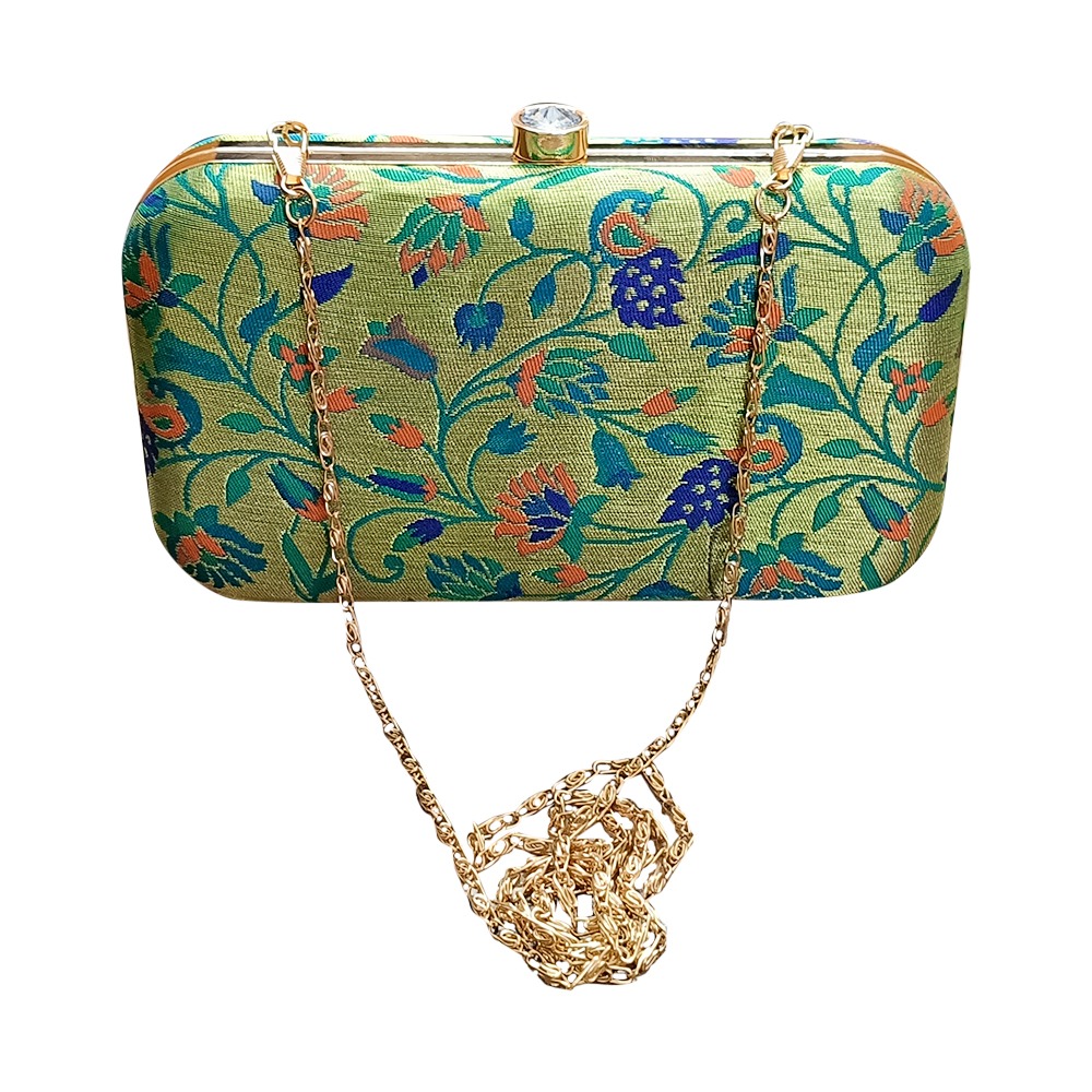 The clutch features traditional peacock and floral motifs, woven into a golden-green base with multicolor threads, showcasing timeless Maharashtrian craftsmanship.