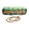 A stunning green rounded Paithani clutch featuring peacock motifs, golden zari work, and a sparkling top clasp.