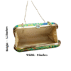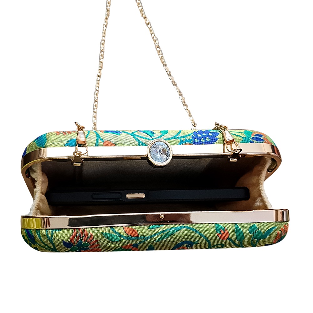 Add a touch of tradition to your festive look with the Small Peacock Green Paithani Clutch. This elegant clutch is crafted from high-quality golden zari semi-paithani fabric, featuring intricate peacock and floral patterns in vibrant hues of green, blue, and red. Designed in a sleek rounded silhouette with a sparkling gem clasp, it is the perfect blend of cultural charm and modern style.